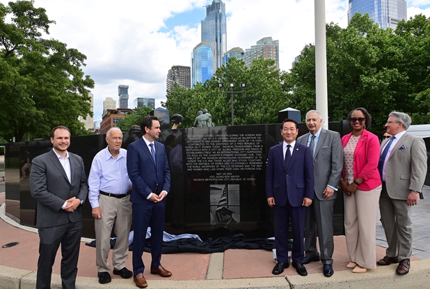 ▲ 유정복 인천광역시장이 미국 뉴저지 저지시티(Jersey City) 한국전쟁기념공원에서 열린 인천시 기념비 헌정식에서 스티븐 풀롭(Steven Fulop) 저지시티 시장, 조셉 파나핀토(Joseph A Panapinto Sr.) 파타핀토 프로퍼티스 회장 등 참석자들과 제막식을 하고 있다. |
