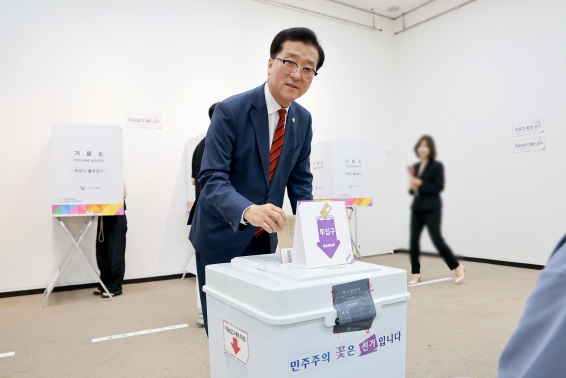 [뉴스서치] 대전시의회 조원휘 의장은 제21대 대통령선거 사전투표 첫날인 29일 대전시청 1층 전시실에 마련된 둔산1동 사전투표소를 방문해 투표에 참여했다.
