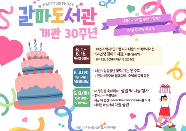 도서관은 6월 1일부터 15일까지 ▲30년간 사랑받은 최다 대출 도서 전시 ▲94년생 갈마도서관, 퀴즈풀기 자료실 이벤트를 운영하고, 6월 4일 대전시립합창단과 함께하는 찾아가는 연주회를 시작으로 6월 8일 지역주민의 문화 향유를 위한 ▲흥이 나는 우쿨렐레 ▲소프라노&테너의 아름다운 노래 ▲지혜준 마술사 공연과 ▲생일 축하 떡 나눔 이벤트 등으로 30주년을 기념할 예정이다.