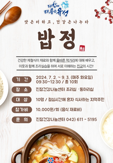 [뉴스서치] 대전 유성구는 9월 3일까지 총 10주간 진잠건강나눔센터에서 지역주민을 대상으로 건강음식 프로그램 ‘밥정(情)’을 운영한다.