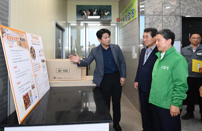 이날 김충섭 김천시장과 남성현 산림청장은 호두 가공업체 투마루(대표 김용준)의 ‘호두먹빵’ 제조 과정과 가공시설을 둘러보고 유통 활성화 등의 애로사항을 청취했다.