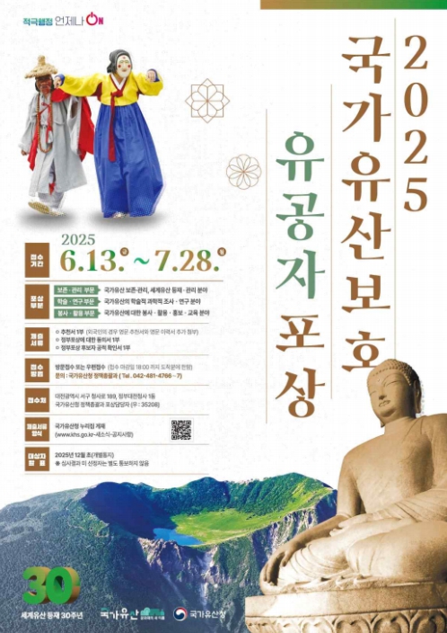 [뉴스서치] 국가유산청은 국가유산의 보존·연구·활용 분야에서 뛰어난 공적을 세운 개인과 단체를 찾아 포상하기 위해 '2025년도 국가유산보호 유공자 포상' 후보자를 6월 13일부터 7월 28일까지 접수받는다.