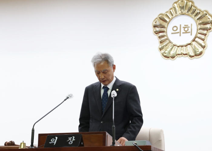 25일 열린 제273회 임시회 제2차 본회의에서 군포시의회 이길호 의장은 선제적 유해․위험 요인 발굴로 사고 예방, 안전수칙과 절차 생략 거부 등의 내용을 담은 안전․보건 경영방침을 낭독했다.