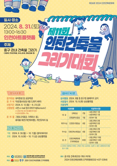 대회는 오는 8월 31일 인천아트플랫폼 중앙광장에서 열릴 예정이다. 참가자들은 행사 당일 개항장 근대건축물, 차이나타운, 동화마을 등 중구 관내 건축물을 주제로 그림을 그리면 된다. 참가비는 무료로, 개인 준비물은 그림 도구(물감, 크레파스 등), 휴대용 화판(개인 테이블), 돗자리 등이다.