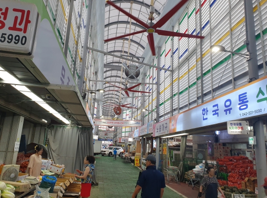 이번 사업은 여름철 무더위에도 전통시장내 시원한 환경조성을 위한 것으로 폭염저감장치 방식 중 하나인 아케이드 상단에 공기순환팬을 설치하는 시장맞춤형 사업으로 추진 사업의 효과성을 높였다