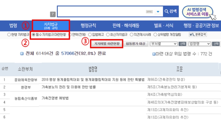 ▲ 국가법령정보센터 메인 화면(① ‘자치법규’를 클릭, ② ‘필수조례 마련현황’을 클릭, ③ ‘지자체별 마련현황’을 클릭하면 된다.) |