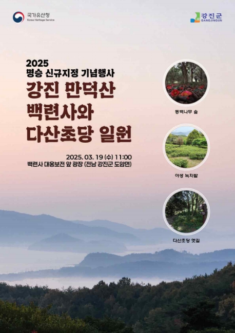 [뉴스서치] 국가유산청은 3월 19일 '강진 만덕산 백련사와 다산초당 일원'을 자연유산 명승으로 지정하고, 이를 기념해 오전 11시부터 전남 강진 백련사에서 명승 지정 기념행사를 개최한다.