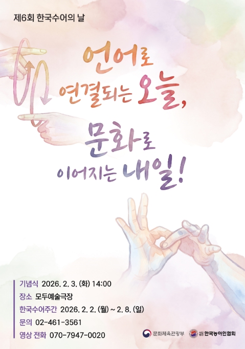 [뉴스서치] 문화체육관광부는 2월 3일 오후 2시, 모두예술극장에서 ‘한국수어의 날’을 기념해 한국수어의 가치와 중요성을 널리 알리고자 ‘제6회 한국수어의 날’ 기념식을 개최한다.