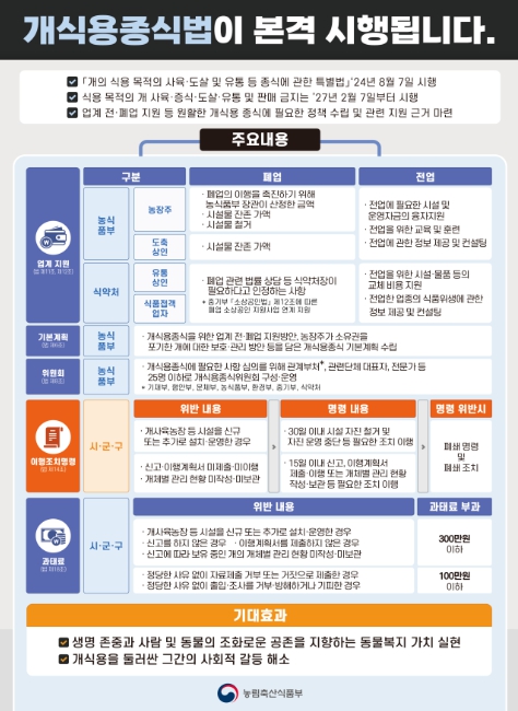 [뉴스서치] 농림축산식품부는 국무회의 의결을 거친 '개의 식용 목적의 사육·도살 및 유통 등 종식에 관한 특별법 시행령안'이 8월 7일 시행된다고 밝혔다.
