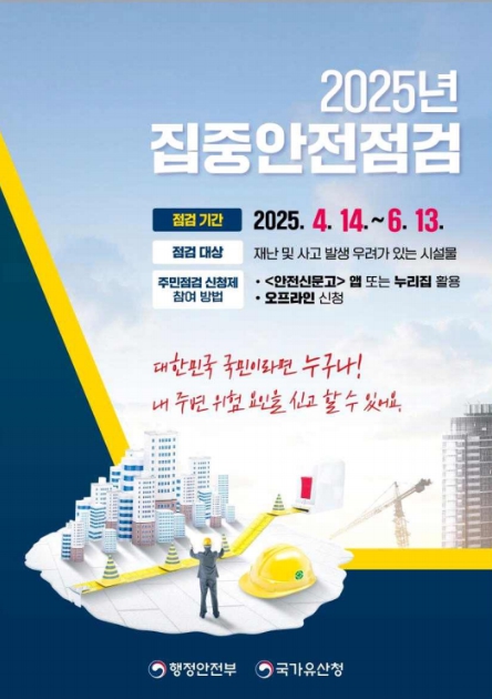 ‘국가유산 집중안전점검’은 행정안전부의 지침에 따라 국가유산청, 지방자치단체, 공사·공단 등 관계기관, 민간전문가가 함께하는 민관합동점검으로, 풍수해 대비 특별 안전점검과 연계하여 추진된다.