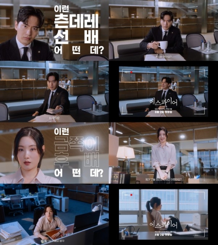 특히 카메라를 응시하는 이진욱과 정채연은 마치 1타 강사처럼 자신의 캐릭터를 쏙쏙 설명하듯 보여주며 ‘에스콰이어’에서 펼쳐질 츤데레 상사와 금쪽이 후배의 이야기에 대한 궁금증을 자극한다.