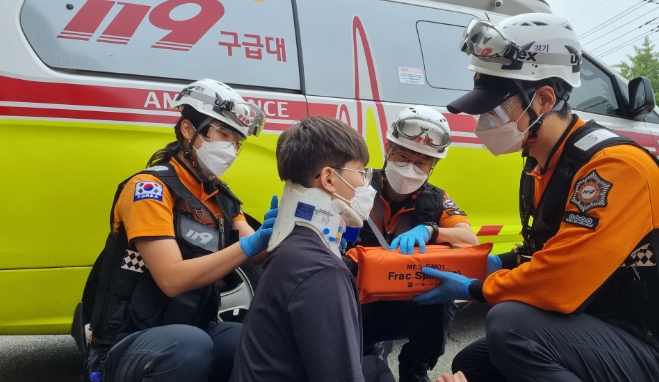 ▲ 파주소방서 구급대원이 교통사고 응급처치 훈련 중 |