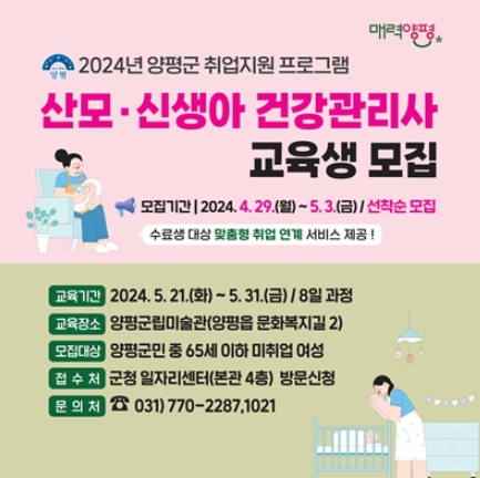 [뉴스서치] 양평군은 2024년 취업지원 프로그램인 ‘산모·신생아 건강관리사’ 교육생을 오는 29일부터 모집한다고 밝혔다.