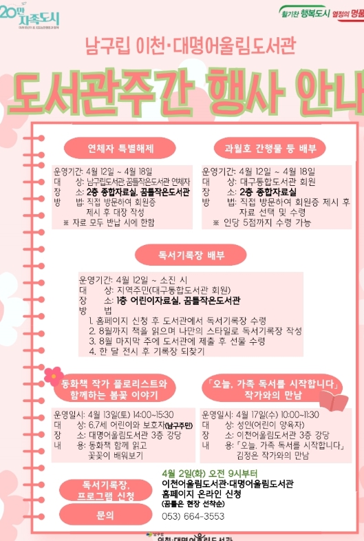 도서관 주간 동안 남구립도서관은 ▲4월 13일 동화책 작가 겸 플로리스트와 함께하는 봄꽃 이야기 ▲4월 17일'오늘, 가족 독서를 시작합니다'김정은 작가와의 만남 ▲4월 12일부터 18일까지 연체자 특별해제, 과월호 간행물 배부, 독서기록장 배부 등을 운영한다.