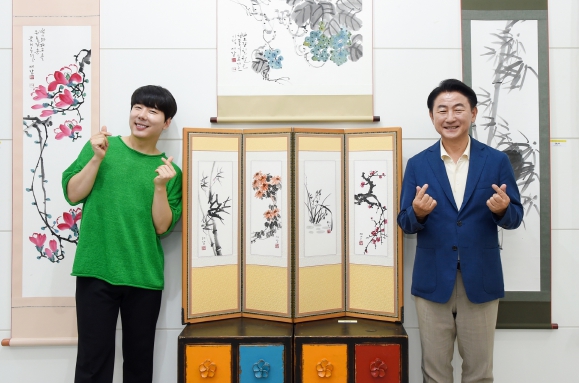 ▲ 김동근 시장이 7월 1일 시청 시민갤러리에서 전시를 진행하는 비니쌤과 기념사진을 찍고 있다. |
