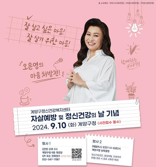 또한, 이날 오전 11시부터 오후 2시까지는 구청 남측광장에서 정신건강검사, 인생네컷 사진촬영, 환청 체험 등 주민들이 직접 체험할 수 있는 다양한 부대행사를 운영하는 ‘계양구, 생명사랑 생명존중 캠페인’도 병행한다.