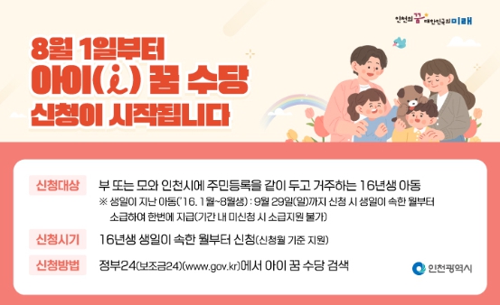 2024년 지원 대상은 부 또는 모와 인천시에 주민등록을 같이 두고 거주하는 2016년생 아동이다.