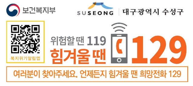 수성구는 오는 8월 발송 예정인 지방세 고지서를 통해 ‘복지위기 알림 앱’과 ‘보건복지부 상담센터 129’를 주민에게 알리고 복지위기가구 제보를 독려할 계획이다.