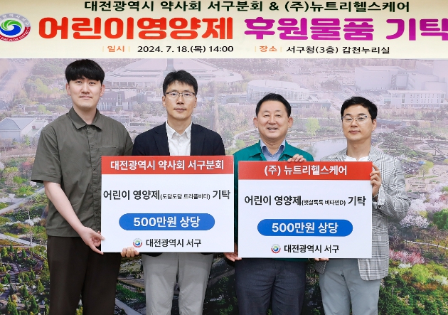[뉴스서치] 대전 서구는 대전광역시약사회 서구분회(회장 박태근)와 ㈜뉴트리헬스케어(이사 김종일)로부터 1,000만 원 상당의 어린이 영양제를 기탁받았다고 19일 밝혔다.