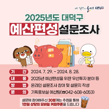 대덕구는 다음 달 28일까지 주민들 대상으로 ‘2025년 대덕구 예산편성 설문조사’를 실시한다고 30일 밝혔다.
