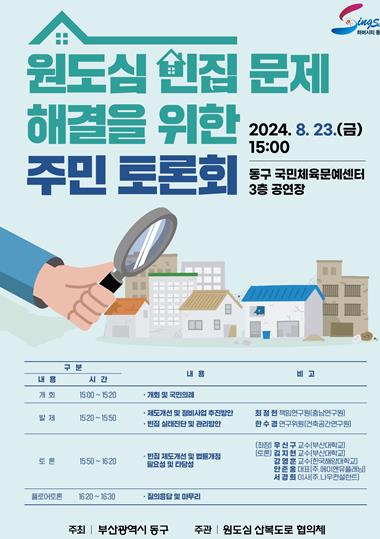 [뉴스서치] 부산 동구는 부산 동구‧원도심 산복도로 협의체(중구 서구 동구 영도구 부산진구) 주최‧주관으로 8월 23일 오후 3시, 동구 국민문예체육센터 3층 공연장에서 “원도심 빈집 문제 해결을 위한 주민 토론회”를 개최한다고 밝혔다.