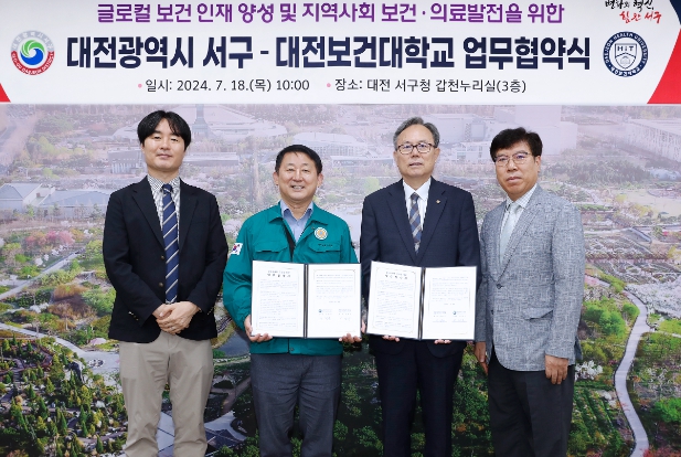[뉴스서치] 대전 서구는 지난 18일 구청 갑천누리실에서 대전보건대학교와 글로컬 보건인재 양성 및 지역사회 보건·의료 발전을 위한 업무협약을 체결했다고 밝혔다.