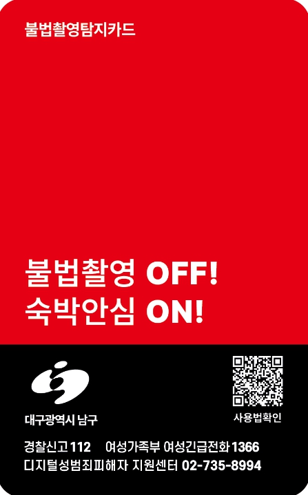 [뉴스서치] 대구 남구는 안전하고 안심할 수 있는 남구의 숙박환경 조성을 위해 숙박업소 대상으로 휴대전화를 활용해 불법 촬영 카메라를 찾아낼 수 있는 불법 촬영 탐지 카드를 제작·배포하여 불법 촬영 근절에 나선다.