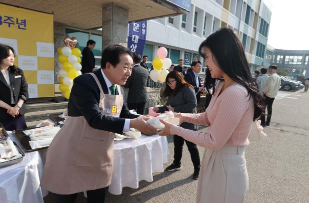 취임 8주년을 맞은 송 군수는 이른 아침부터 지역 농·특산물을 활용해 개발하고, 농다리 스토리움에서 판매 예정인 지역 먹거리 간편식(메기 탕후루, 메기 어묵, 쌀 핫도그 등)을 직원들에게 손수 전했다.