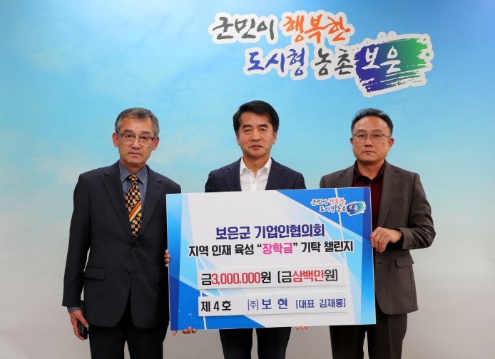 [뉴스서치] 보은군 보은읍 길상리에 운영하고 있는 ㈜보현 김재홍 대표는 11일 보은군청을 방문해 지역 인재육성에 써달라며 장학금 300만원을 보은군민장학회에 기탁해 보은군기업인협의회(회장 류성모, 동양기업 대표)가 추진하고 있는 기탁 챌린지에 4번째로 동참했다.