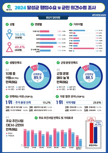 이번 조사 결과는 달성군의 지속가능한 발전과 군민 삶의 질 향상을 위한 중요한 지표로 활용될 예정이며, 향후 정책 수립 및 사업 추진에 적극 반영될 것으로 기대된다.