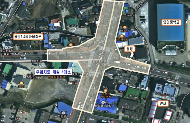 함양 중고등학교 주변 도로환경 개선사업은 교산리 함양중학교 사거리의 원활한 차량흐름과 보행자 안정성을 높이기 위해 교차로 내 우회전 차로를 개설하는 사업으로 4월 준공을 목표로 추진 중이다.