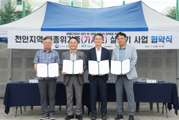 시는 9일 직산 삼은공원에서 금강유역환경청, ㈜신세계푸드, 천리포수목원과 ‘천안지역 멸종위기종 살리기 사업 협약’을 체결했다.