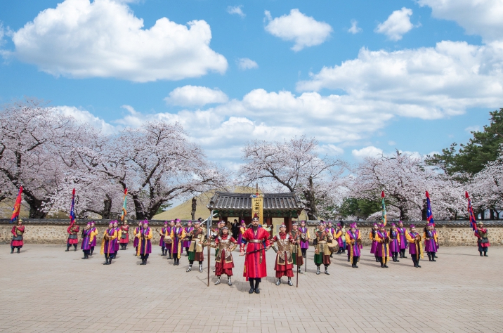 ▲ 신라고취대가 지난해 3월 벚꽃시즌을 맞아 분황사에서 야외 특별공연을 펼치고 있다. |