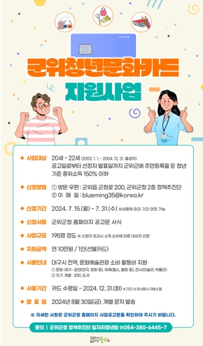 [뉴스서치] 군위군은 지역내 거주 청년들의 문화생활 향유 및 자기계발 기회를 제공하고 청년들의 문화 여가생활 만족도를 높이기 위해 2024년 청년문화카드 지원사업을 추진한다고 밝혔다.
