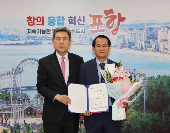 ▲ 최제민 포항시 청소년재단 신임 대표이사(오른쪽)가 12일 임명장을 수여받고 있다. |