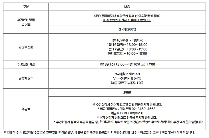 수강 정원은 200명으로 1월 8일(수) 오후 1시부터 10일(금) 오후 5시까지 KBO 홈페이지 수강신청 접수 창을 통해 선착순으로 접수를 마감한다. 기타 문의사항은 KBO 홈페이지 내 기록위원회 스코어링 필드, 1:1문의하기를 이용하면 된다.