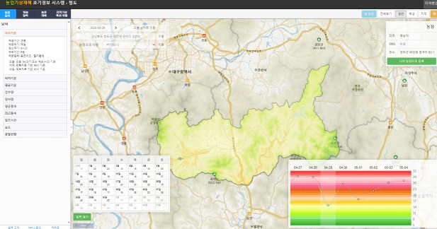조기경보 서비스는 기본 읍면 단위(5kmⅹ5km)의 기상청 동네예보보다 상세한 농장 단위(30mⅹ30m)의 기후정보를 제공하고 농장의 고도, 지형, 지표면의 피복 상태 등을 고려해 40개 작물 대상 기상정보 11종(기온·강수량·습도·풍속·일조시간 등)을 농업인에게 제공하는 사업이다.