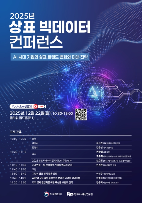 [뉴스서치] 지식재산처가 주최하고 한국지식재산연구원이 주관하는 ‘2025년 상표 빅데이터 학술회의’가 12월 22일 10시 30분 엘타워 골드홀(서울 서초구)에서 개최된다.