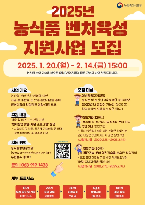 [뉴스서치] 농림축산식품부는 2025년 농식품 벤처창업활성화 지원을 위해 '농식품 벤처육성 지원사업' 및 '민간투자기반 스케일업 지원사업' 참여 (예비)기업을 1월 20일부터 모집한다.