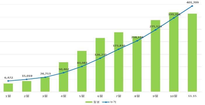 온라인도매시장 거래금액은 6월 17일 1,000억원을 달성한 후, 8월 20일 2,000억원, 10월 15일 3,000억원, 11월 15일 4,000억원을 돌파하며, 하반기 들어 가파른 성장세를 보이고 있다. 양파 272억원, 사과 268억원, 마늘 210억원, 당근 175억원, 쌀 256억원, 계란 495억원 등 다양한 부류의 품목이 거래됐다.