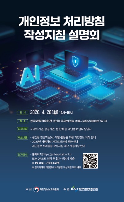 개인정보위는 이번 작성지침 개정 내용에 대한 기업과 현장의 이해를 돕기 위해 4월 28일 한국과학기술회관(서울 강남)에서 설명회를 개최할 예정이며, 참가신청은 홈페이지를 통해 가능하다.