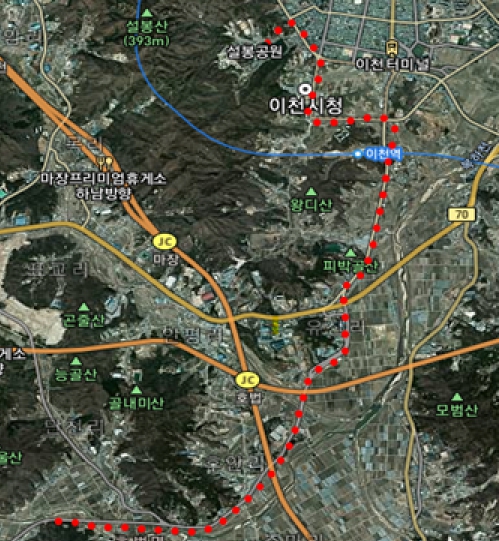 설봉공원(바꿈터) ⇒ 엑스포 삼거리(우회전) ⇒ 이천중앙교회 ⇒ 증일사거리 ⇒ 이천경찰서 ⇒ 이천시청 ⇒ 율현사거리 ⇒ 이천역삼거리 ⇒ 유산교차로 ⇒ 유산3리 ⇒ 나이키 물류창고 ⇒ 주미교차로 ⇒ 매곡교차로 ⇒ 유산3리 ⇒ 매곡교차로 ⇒ 설봉공원