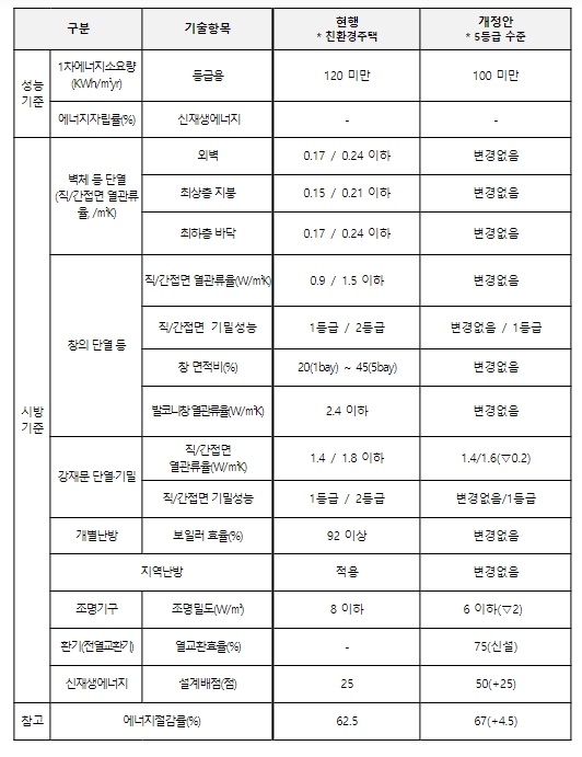 이번 개정안은 신축 공동주택의 에너지 성능을 제로에너지 5등급 수준으로 강화하여 온실가스 감축 및 국민의 에너지 주거비 부담을 완화하고자마련됐다.