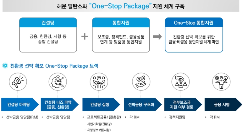 기존에는 국적선사가 친환경선박을 도입할 때 금융기관의 선박금융, 정부 보조금, 컨설팅 등을 각각 개별적으로 문의하고 신청하여 지원을 받아야 했다. 또한, 어느 프로그램이 더 적합한지 비교·결정하는 데도 어려움을 겪었다. 하지만, 앞으로는 한국해양진흥공사를 통해 현 상황 진단부터 금융·친환경·시황에 대한 컨설팅은 물론, 정부 보조금부터 정책금융 실행까지 모든 지원을 한 번에 통합적으로 받을 수 있게 된다.