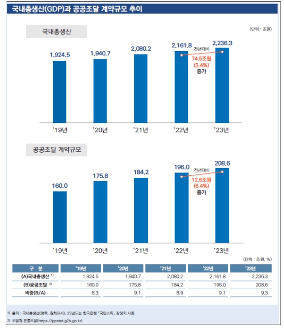 공공조달 규모는 국내총생산(명목GDP 2,236.3조원) 중 9.3%를 차지(역대 최고비율)하면서 공공조달이 내수 활성화와 한국경제 발전에 견인차 역할을 톡톡히 한 것으로 나타났다.