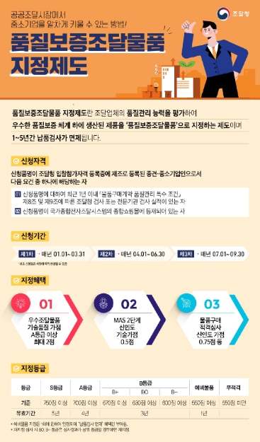 품질보증조달물품은 조달청이 중소기업의 품질관리 능력을 심사해 고품질 제품을 지정하는 제도이다.