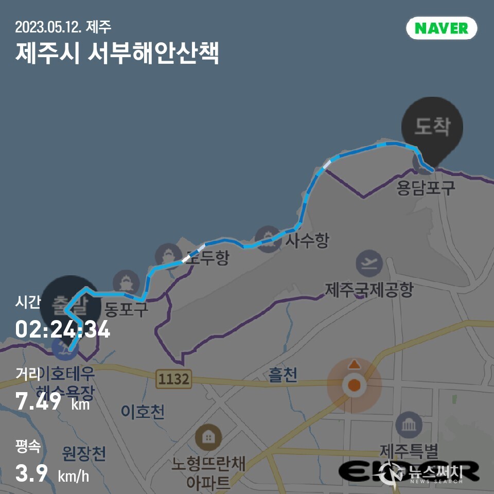 이번 제주시 서부해안과 도두봉 트레킹 거리는 7.49km 였고, 트레킹 시간은 휴식시간을 포함하여 2시간 24분이 소요되었다.