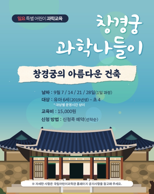 [뉴스서치] 과학기술정보통신부 국립어린이과학관은 창경궁과 협력하여, 과학과 문화유산을 접목한 가족 참여형 프로그램인 '창경궁 과학 나들이'를 운영한다.