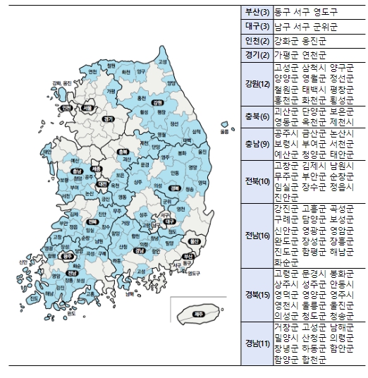 행정안전부는 인구감소지역을 체계적으로 지원하기 위해 2021년 89개 시군구를 인구감소지역으로 최초 지정·고시한 바 있다.