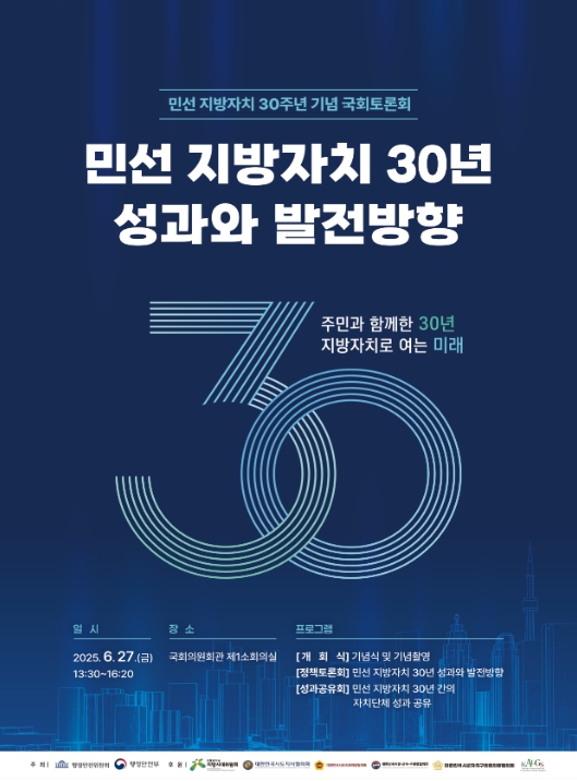 [뉴스서치] 행정안전부는 민선 지방자치 30주년을 맞아 그간의 성과를 되돌아보고 지방자치 발전과제를 모색하기 위해 국회 행정안전위원회와 공동으로 ‘민선 지방자치 30주년 기념 국회토론회’를 개최한다고 밝혔다.